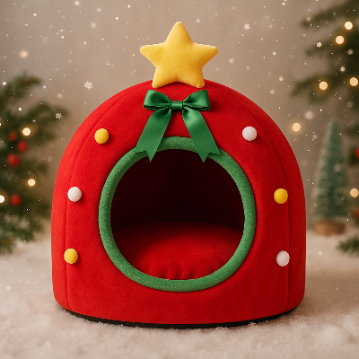 Nos niches de Noël pour chat sont fabriquées avec des matériaux doux et chauds, parfaits pour les siestes hivernales de votre compagnon. Les designs varient des classiques maisons de Noël aux créations plus originales comme des bottes du Père Noël géantes ou des igloos décorés de motifs festifs.